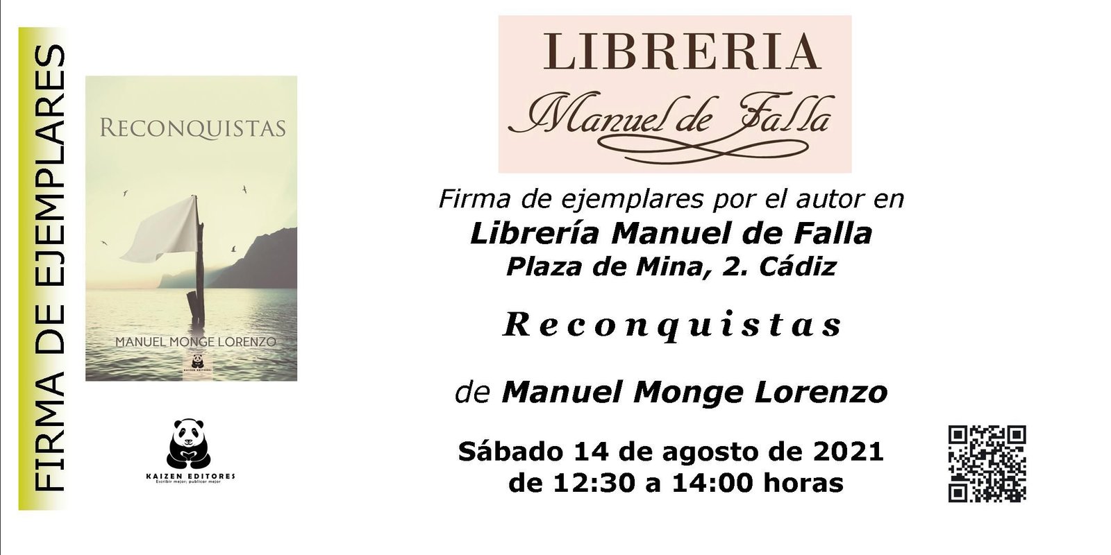 El próximo sábado 14 de agosto tendré el placer de visitar Cádiz y la señera librería Manuel de Falla en la preciosa Plaza de Mina.