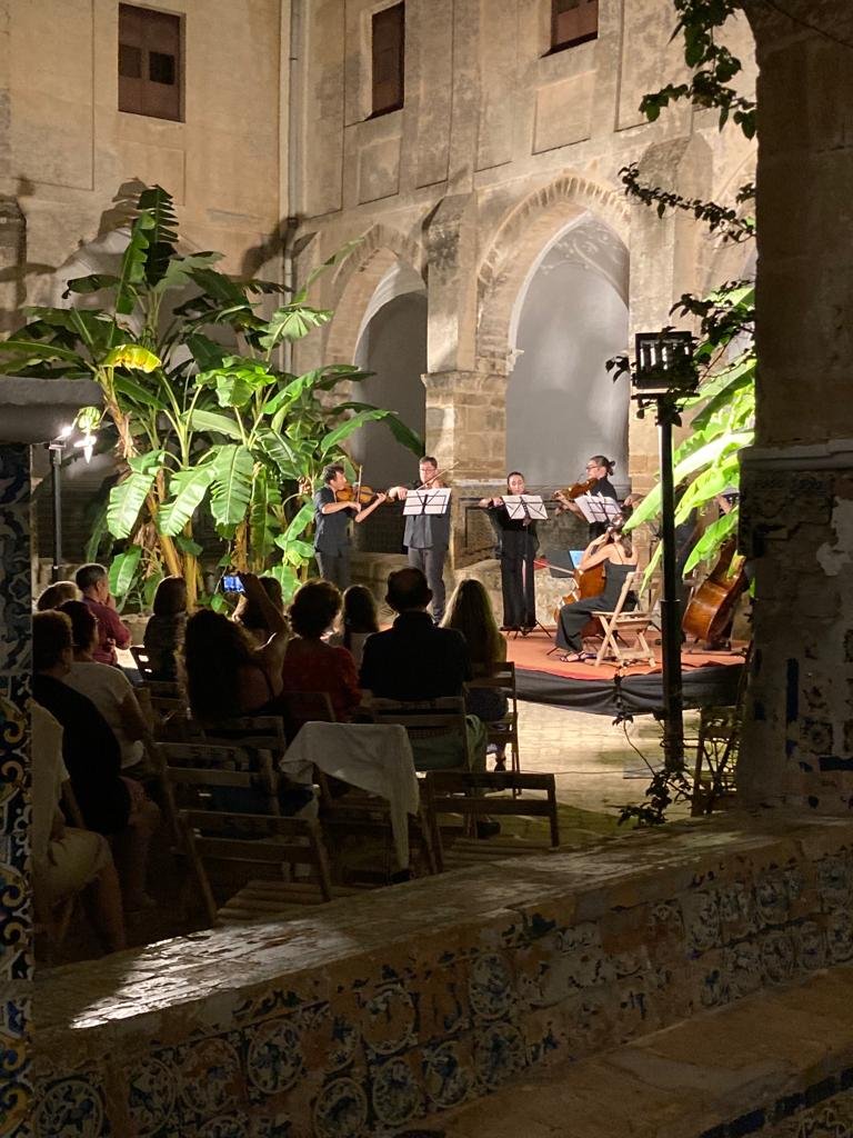 El pasado sábado 6 de agosto disfrutamos del magnífico concierto de la Camerata 1910, enmarcado dentro del XV Festival de Música Ciudad de Chipiona organizado por Juventudes Musicales de Chipiona. El claustro del Santuario de Nuestra Señora de Regla fue el inmejorable escenario del concierto, un remanso de paz inmerso en el epicentro del veraneo chipionero; los plataneros se exhibían exuberantes gracias a la climatología propiciatoria de este intenso y tórrido estío.