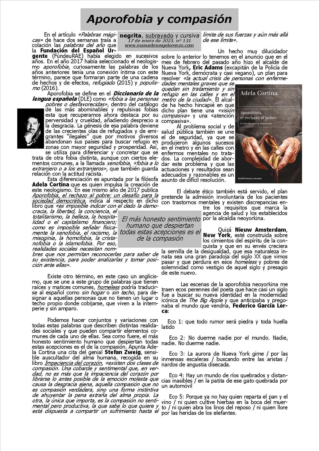 Aporofobia se define en el Diccionario de la lengua española (DLE) como «fobia a las personas pobres o desfavorecidas», dentro del catálogo de las más abominables y repulsivas fobias esta que recuperamos ahora destaca por su perversidad y crueldad, añadiendo desprecio a la desgracia. La génesis de esa palabra deviene de las crecientes olas de refugiados y de emigrantes “ilegales” que por motivos diversos abandonan sus países para buscar refugio en zonas con mayor seguridad y prosperidad. Así, se utiliza para diferenciar y concretar que se trata de otra fobia distinta, aunque con ciertos elementos comunes, a la llamada xenofobia, «fobia a lo extranjero o a los extranjeros», que también guarda relación con la actitud racista.