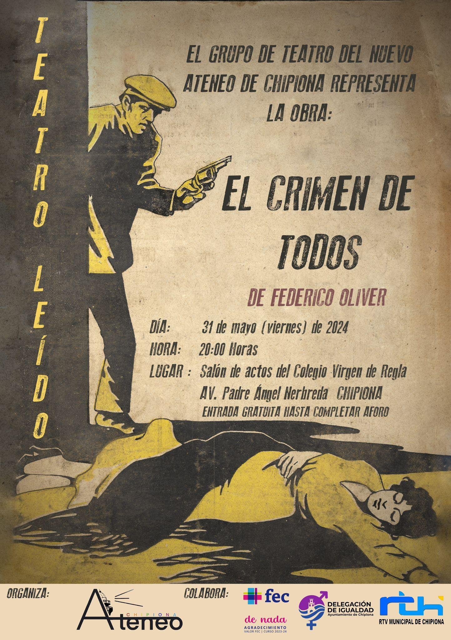 Aprovechando que estamos celebrado el 150 aniversario del nacimiento del dramaturgo y escultor chipionero Federico Oliver, lanzamos la propuesta de hacer en formatos radio-teatro y lectura dramatizada una de sus obras más vigentes hoy en día, El crimen de todos, un exitoso drama en tres actos estrenado en 1916 en el Teatro Español de Madrid y que tiene como tema central la violencia hacia la mujer, el machismo y la chulería.